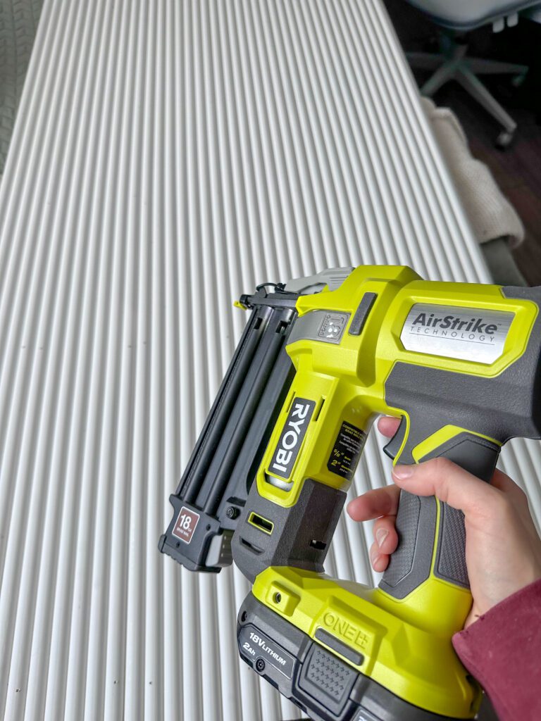After a quick sand to smooth the edges, I used my nail gun to secure each reed molding strip vertically. I tried to ensure that they were lined up perfectly with the door.