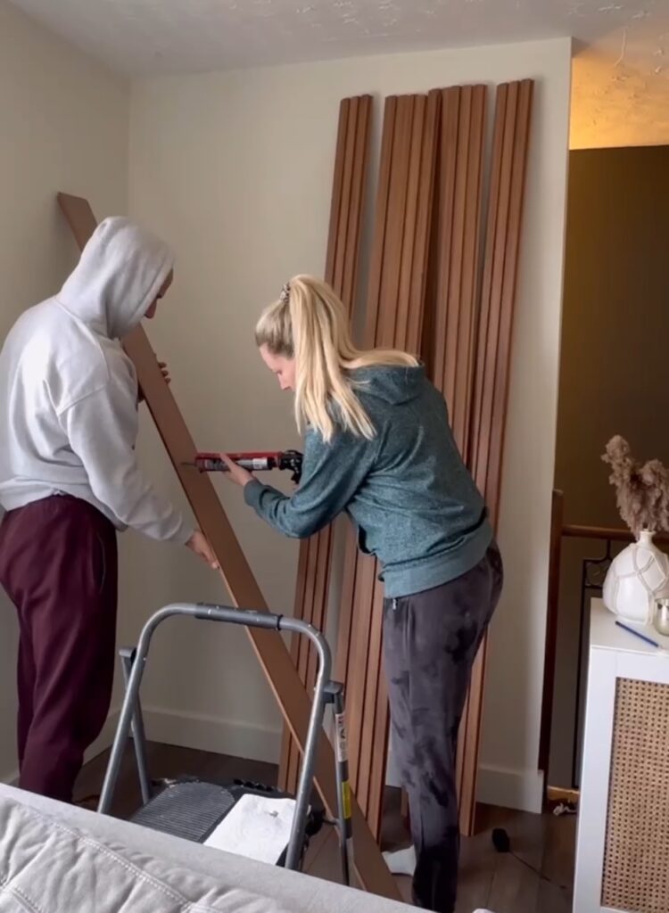 To install the panels, I applied construction adhesive to the back of each one, pressed it firmly against the wall, and secured it with nails using my nail gun. Thanks to their overlapping design, the panels were incredibly easy to install, and the level helped ensure every board was straight.