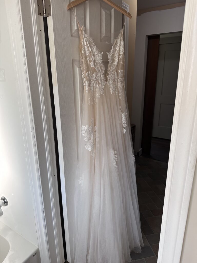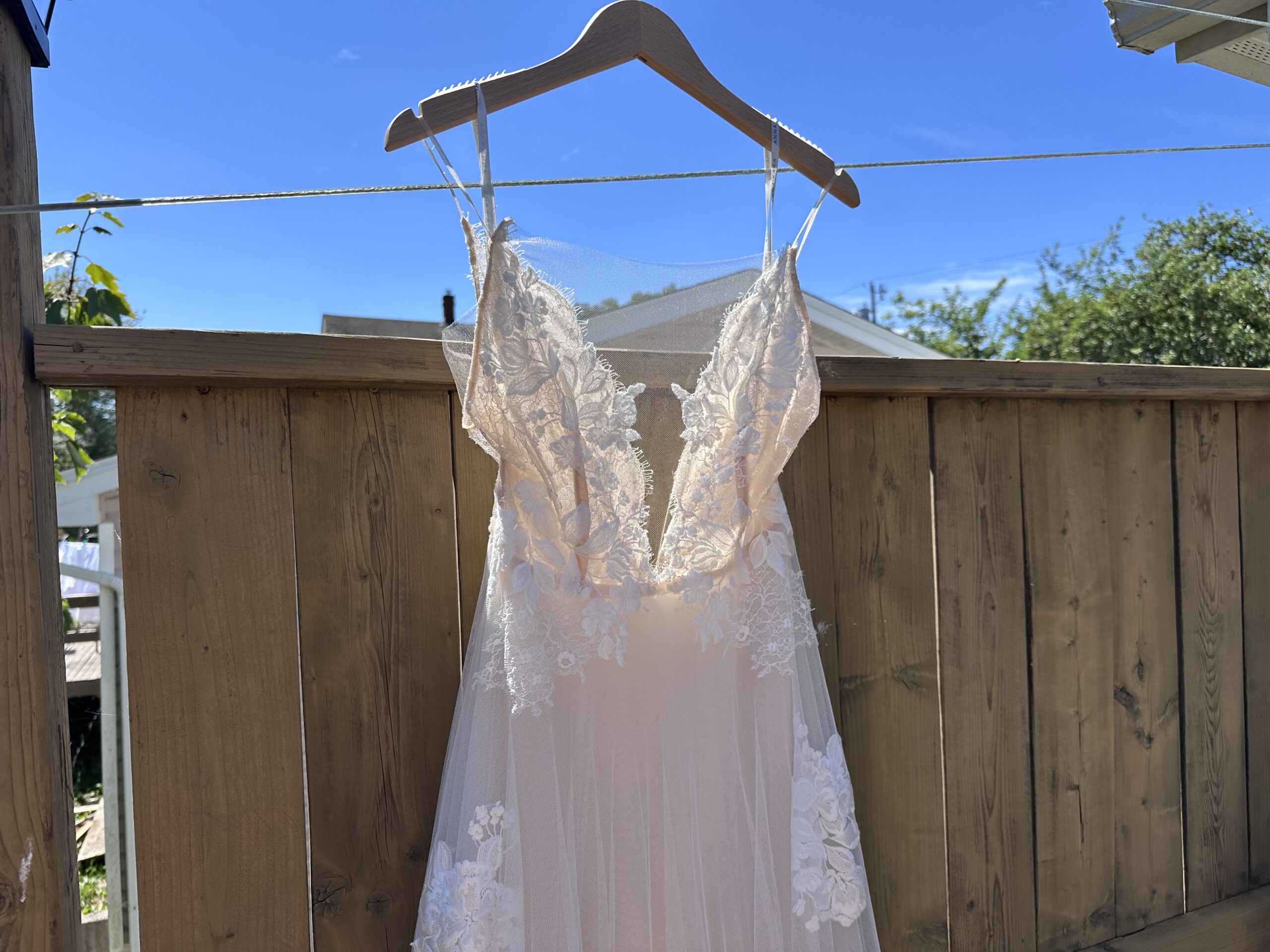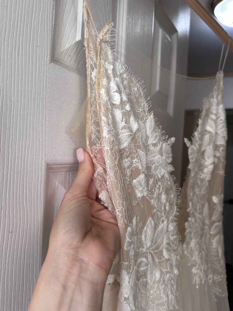 • Condition: My dress only had a spray tan stain under the arms and dirt along the hem from our backyard wedding.