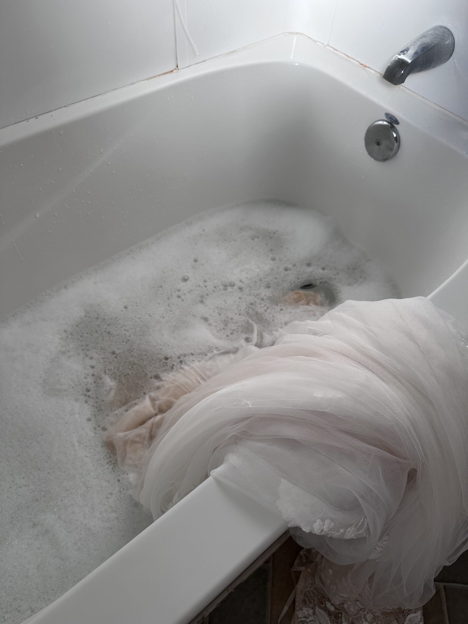If your dress is heavily stained or made of delicate fabrics, I’d recommend professional cleaning. But for me, mine was lace and tulle with light dirt, so I figured a gentle at-home approach could work.