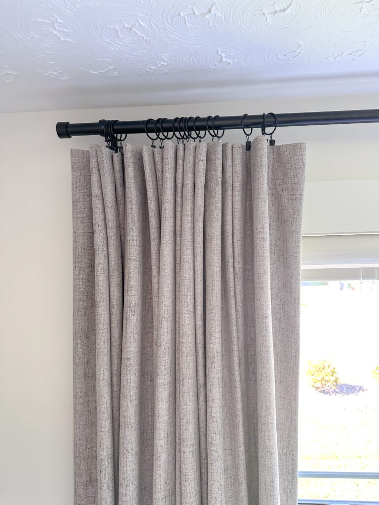 If you are opting for a more budget friendly curtain option I also love my Joyco curtains purchased on Amazon. These curtains are an affordable option and when hung with curtain rod ring hooks you can create a designer look on a budget. Here is a link to the exact curtains (this link earns me a small commission). I have hung along with the rod and hooks!