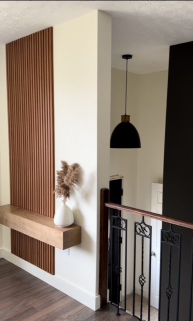 I also created a custom wood panel feature on the small half-wall that runs alongside the stairs. This space often gets overlooked, but by adding vertical wood slats and a custom shelf, it became a mini moment of design. Styled with a textured vase and stems, this detail gives the space a refined, earthy look—exactly what you’d want in a modern organic living room.