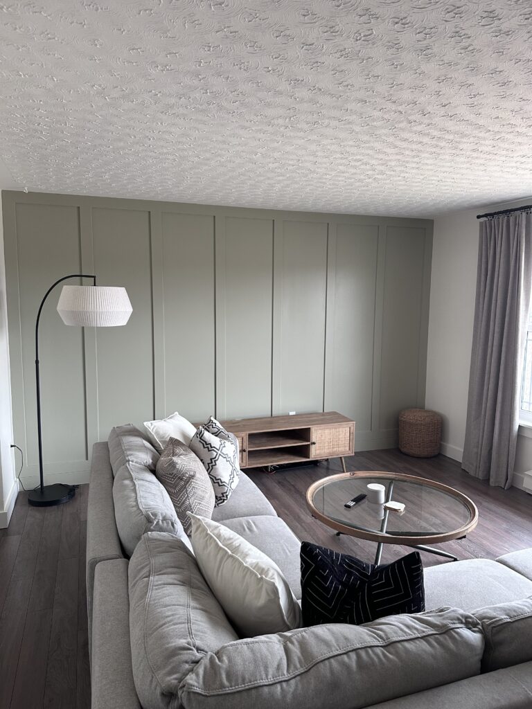 I installed this to bring dimension and character. I originally painted French Grey by Farrow and Ball. A year later, I repainted it Dover White for a more cohesive, neutral feel so it matches the rest of my living room. Even in the same color, it still acts as a quiet focal point thanks to the added texture. If you want to add subtle texture to your modern minimalist living room check out my full tutorial here EASY BOARD AND BATTEN WALL: EVERYTHING YOU NEED TO KNOW