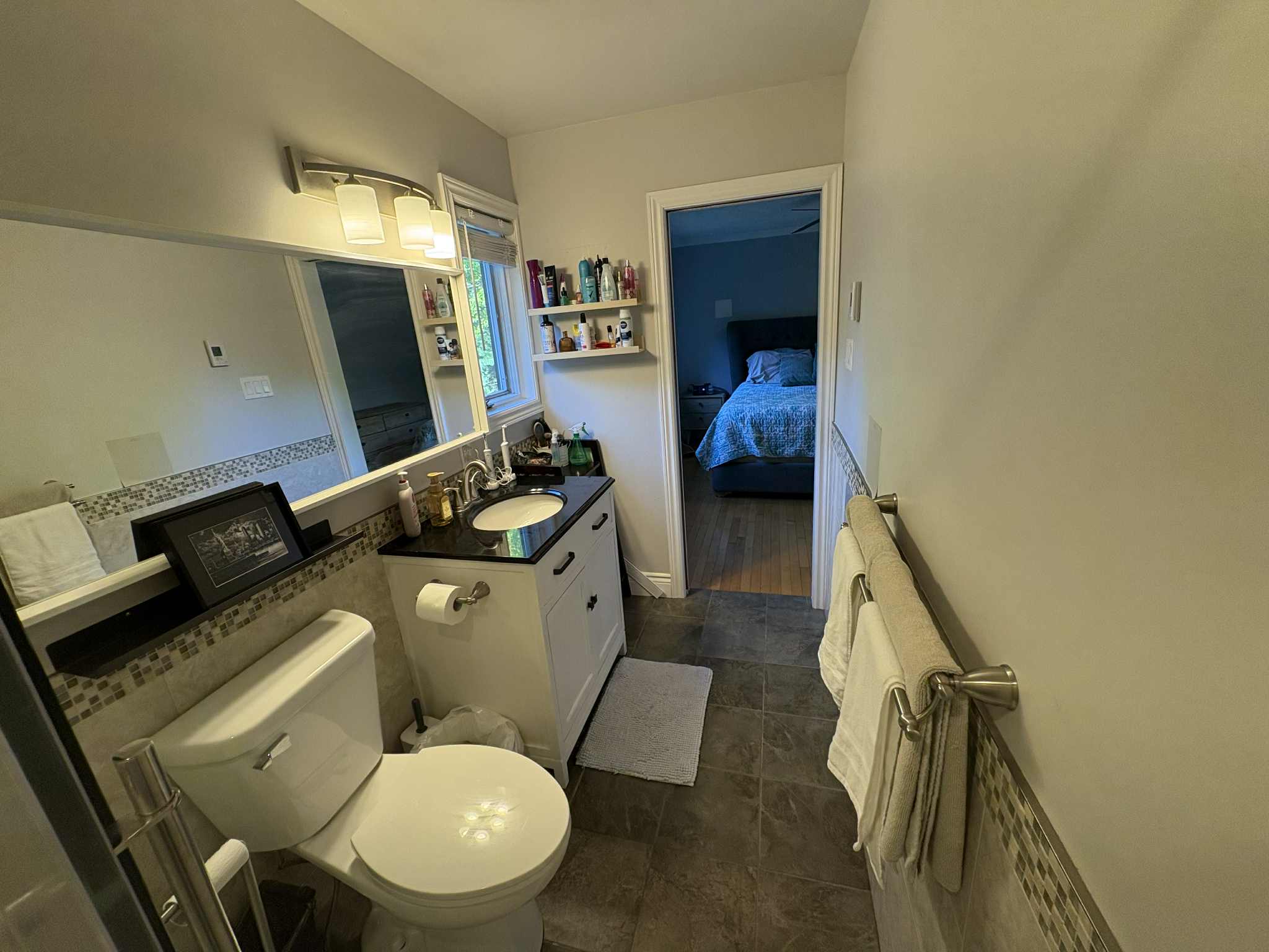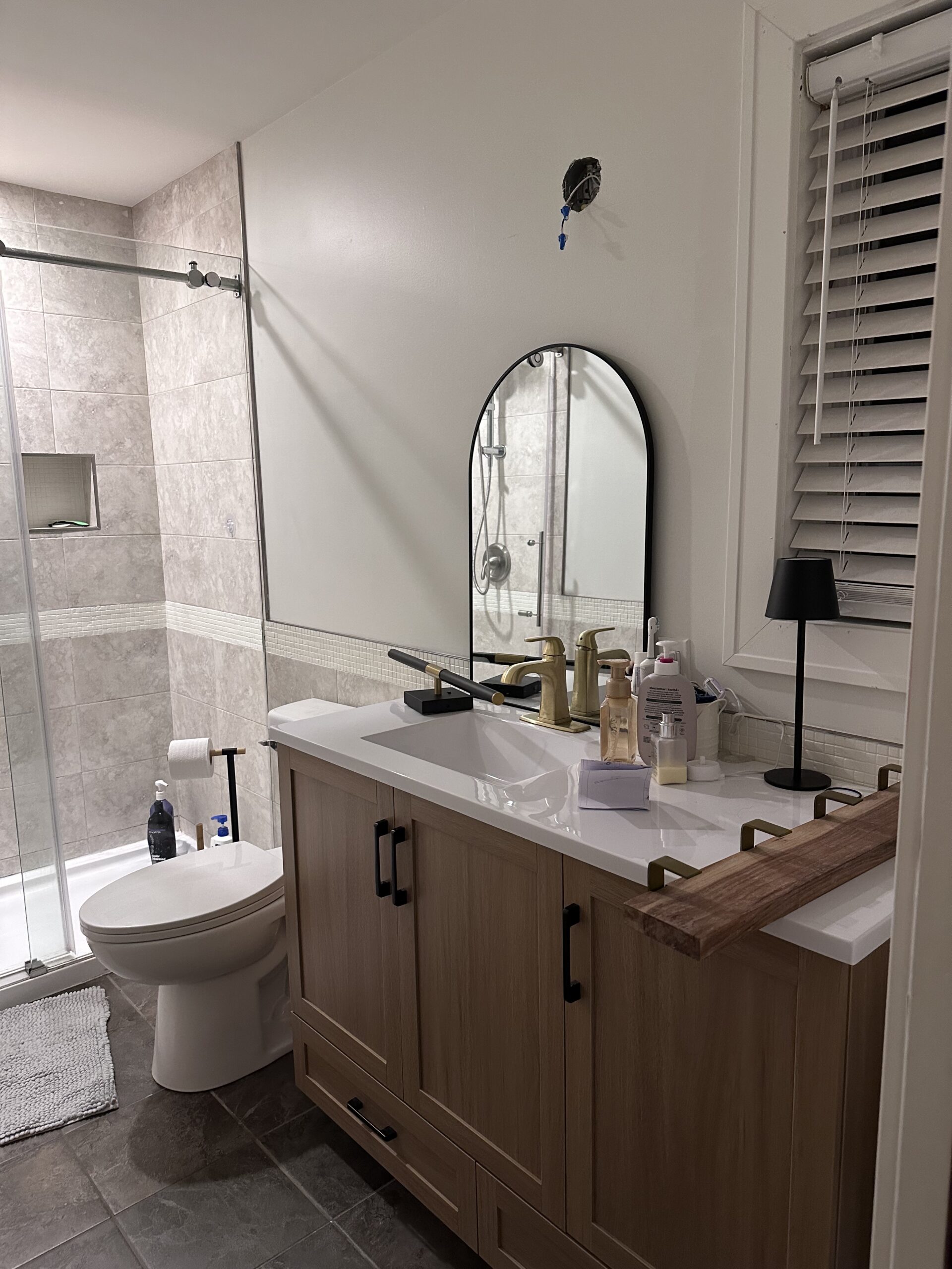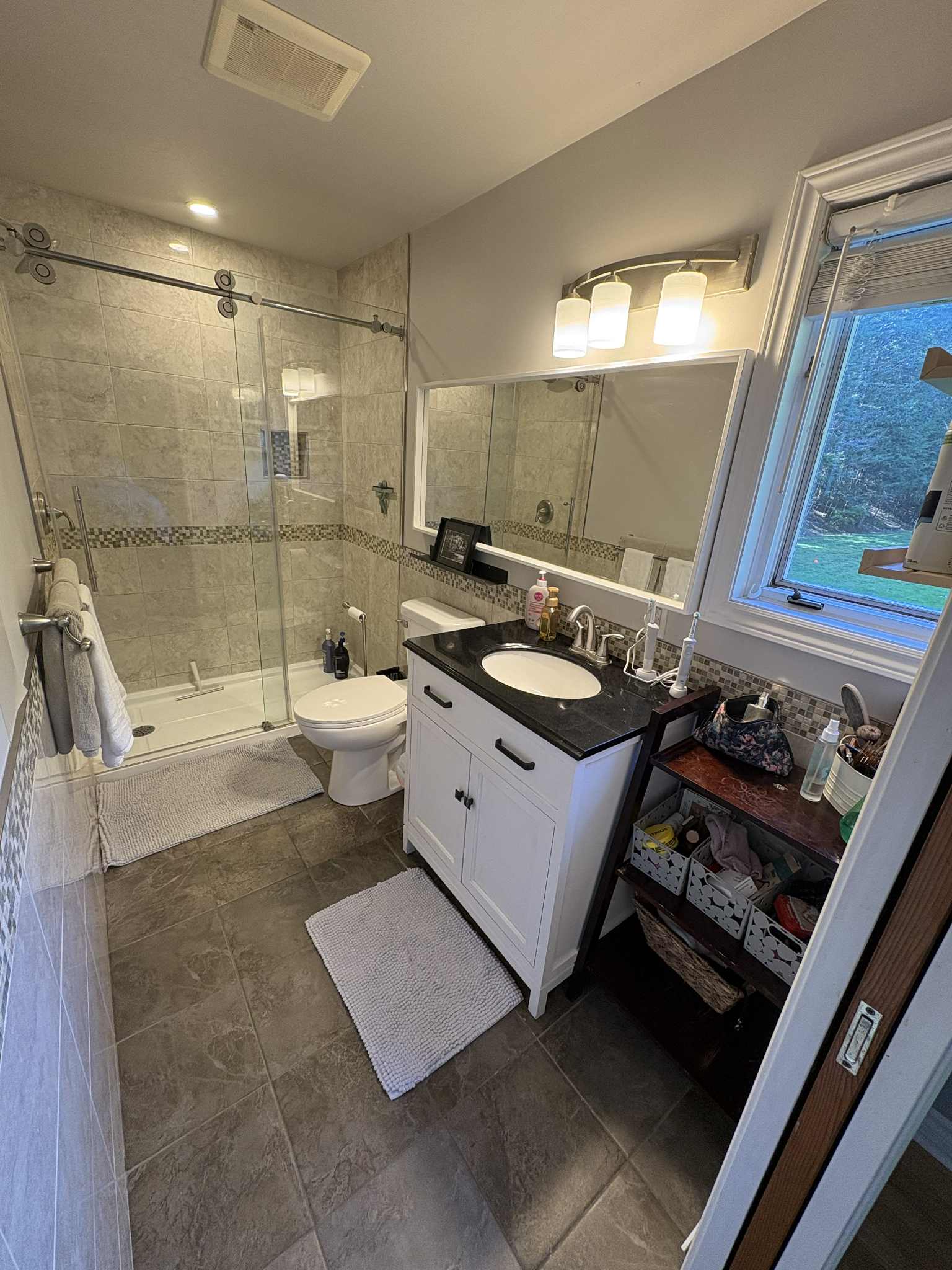 One of the most important changes in this bathroom was replacing the vanity. We chose a bathroom vanity with storage that better fit the space and extended it fully to the wall, instantly improving both function and layout.