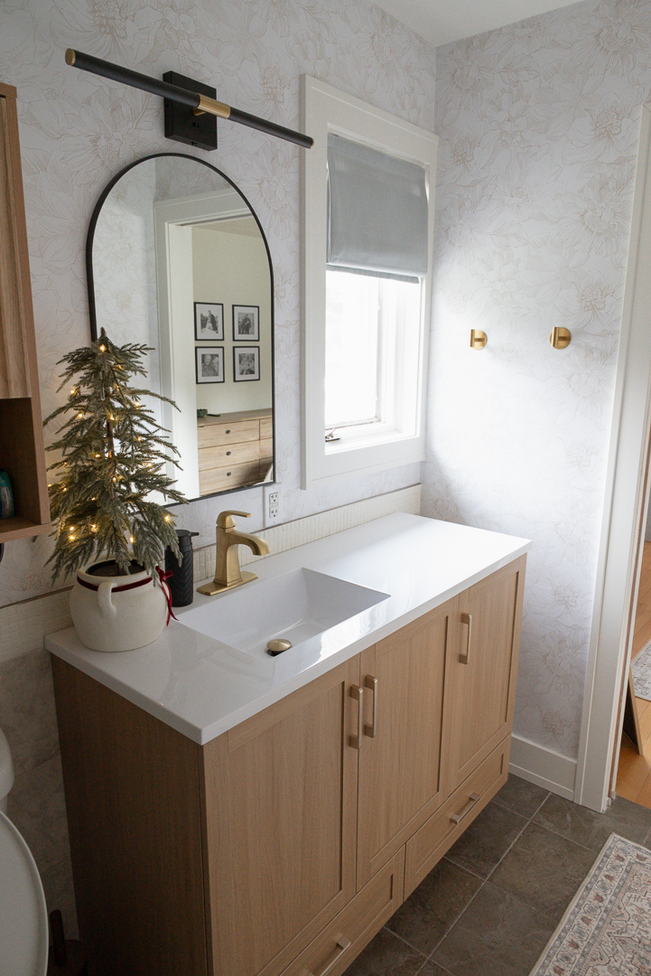 Originally, my aunt disliked the bathroom floor, but once the new vanity, wallpaper, and rug were installed, it completely changed how the floor looked. It now adds contrast and depth rather than feeling dated.